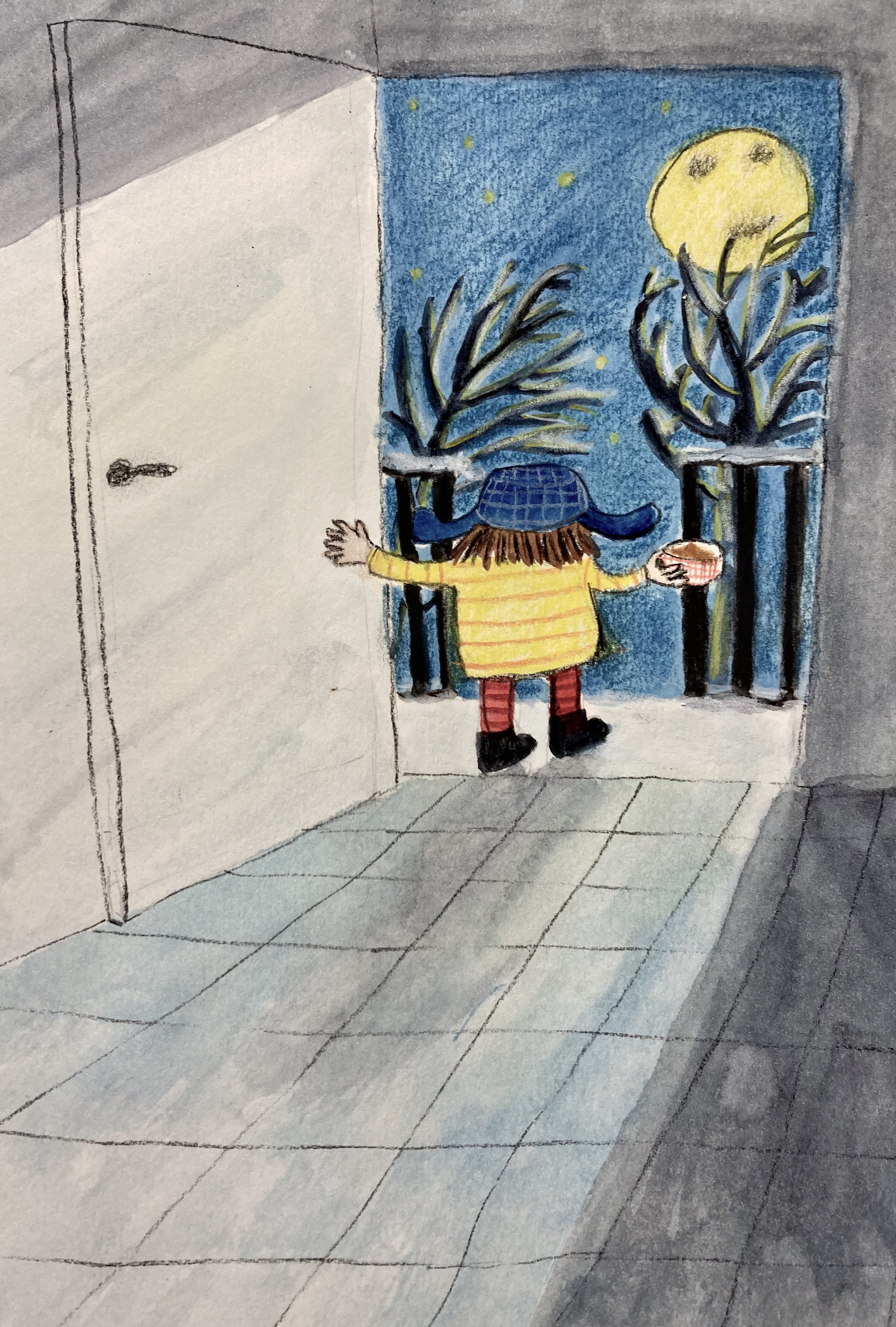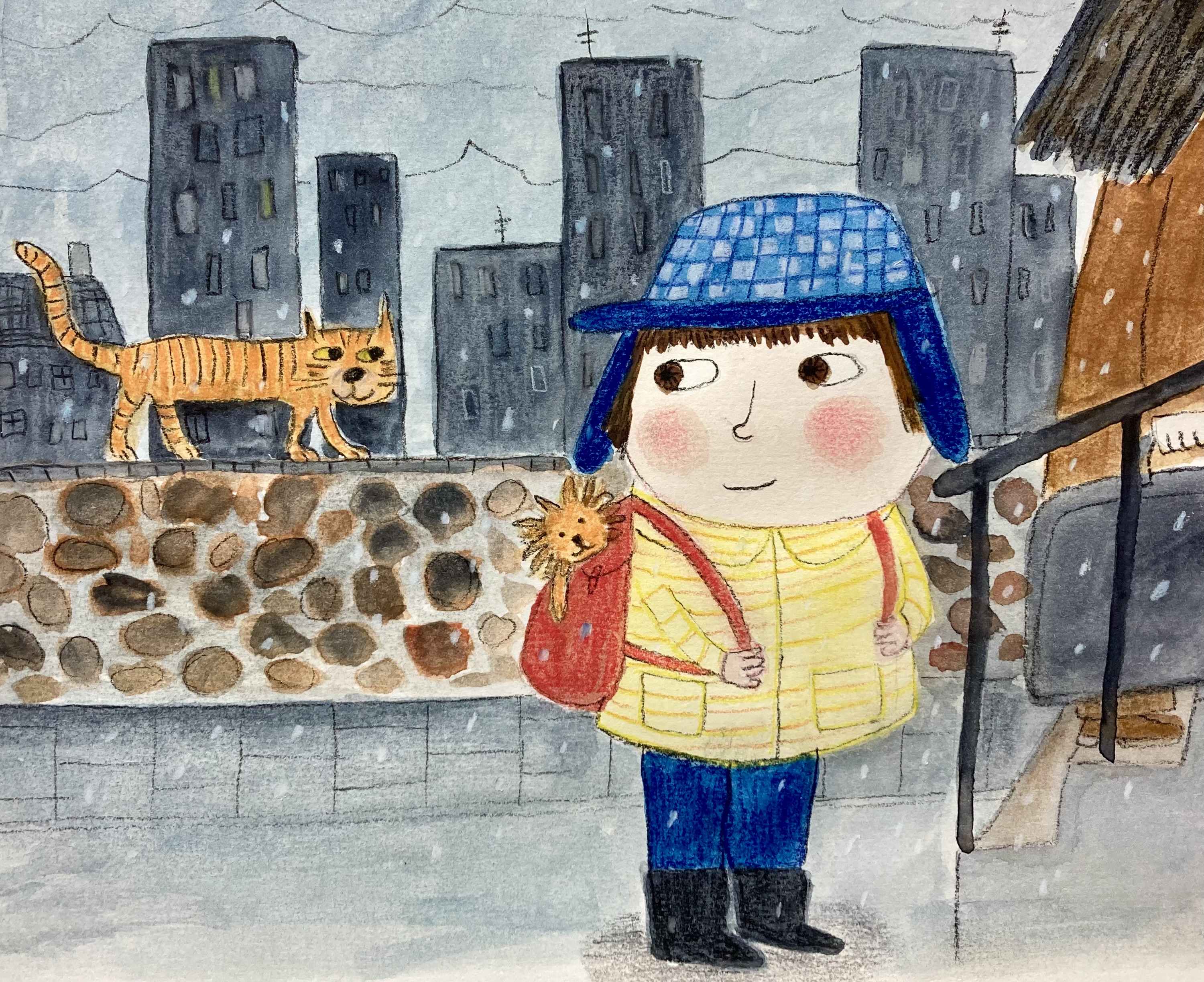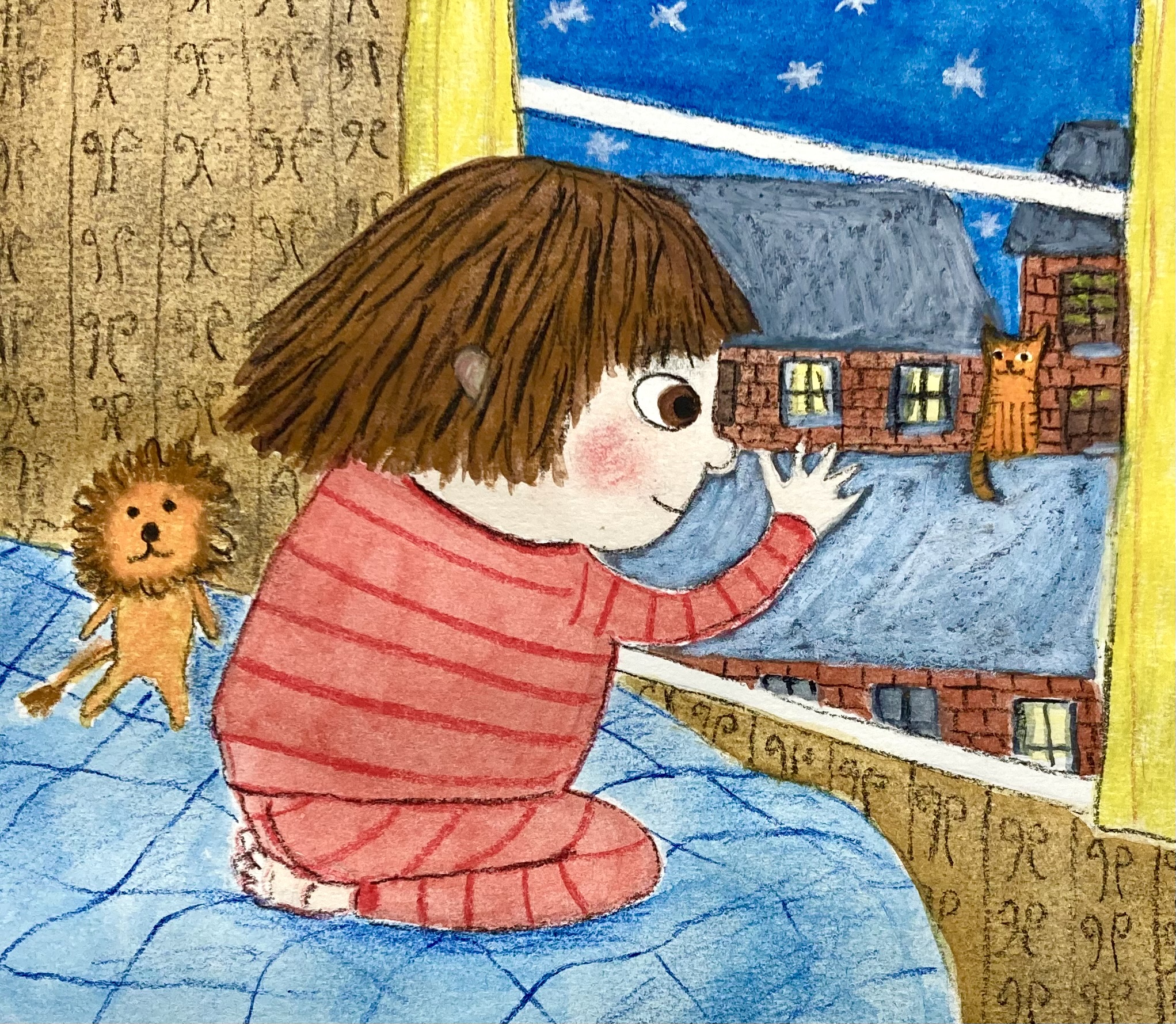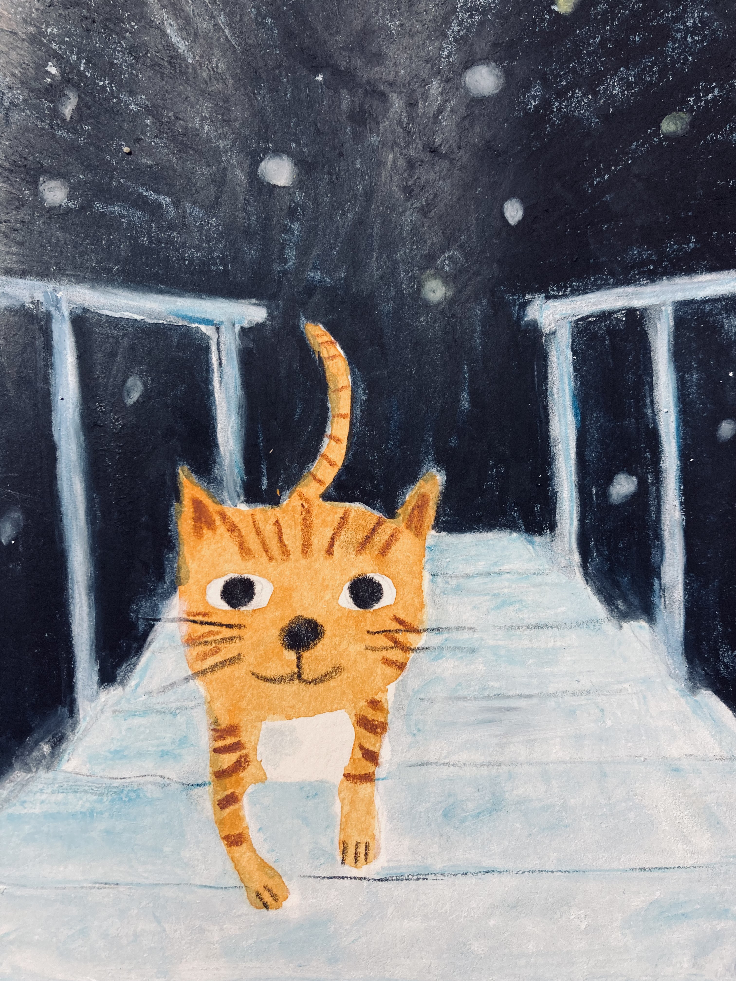 Homeless Oscar sees a stray ginger cat outside his new temporary home, and wonders if it is homeless like him and his mum. A series of six images for Orange Beak’s illustration challenge “Once Upon a Winter”