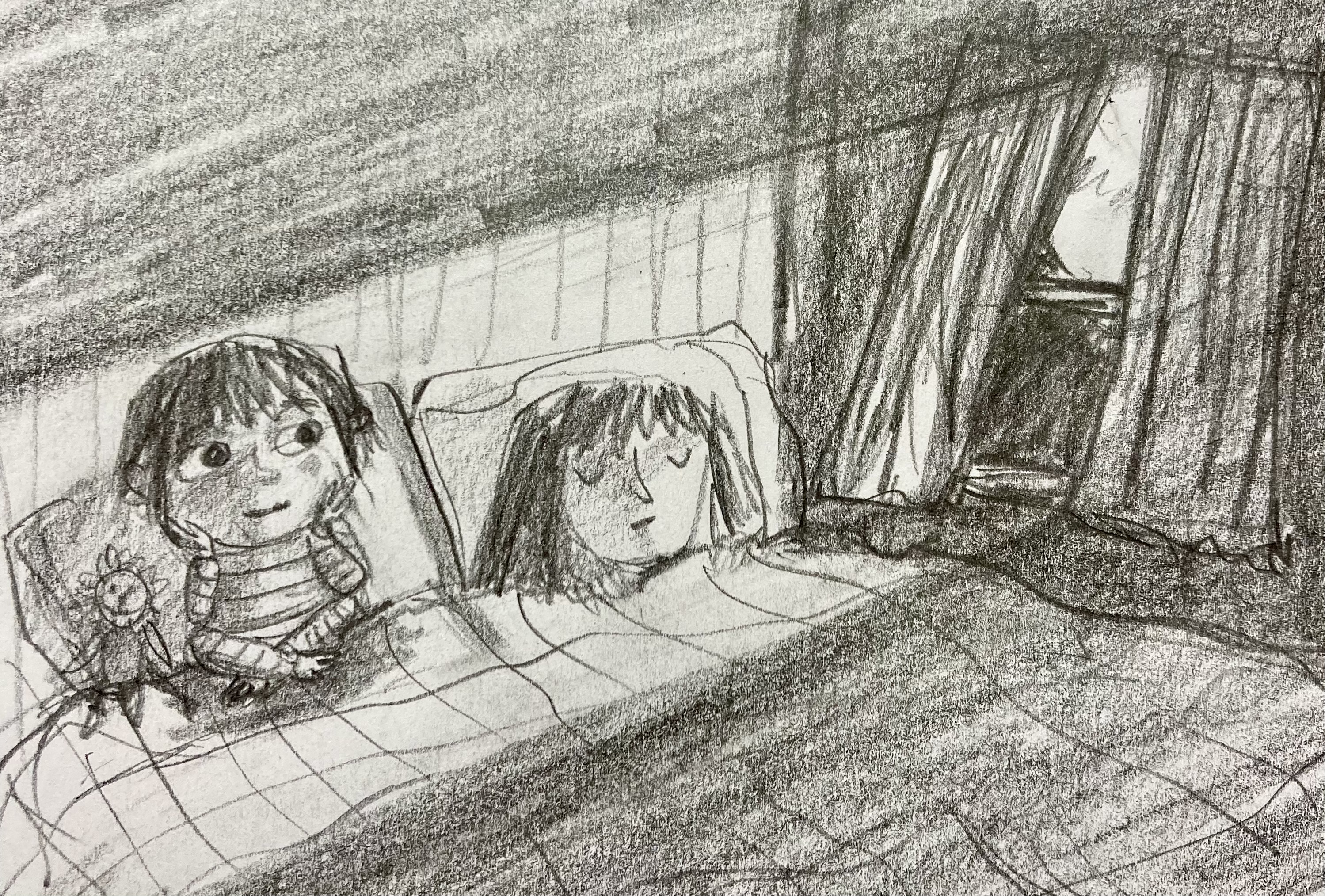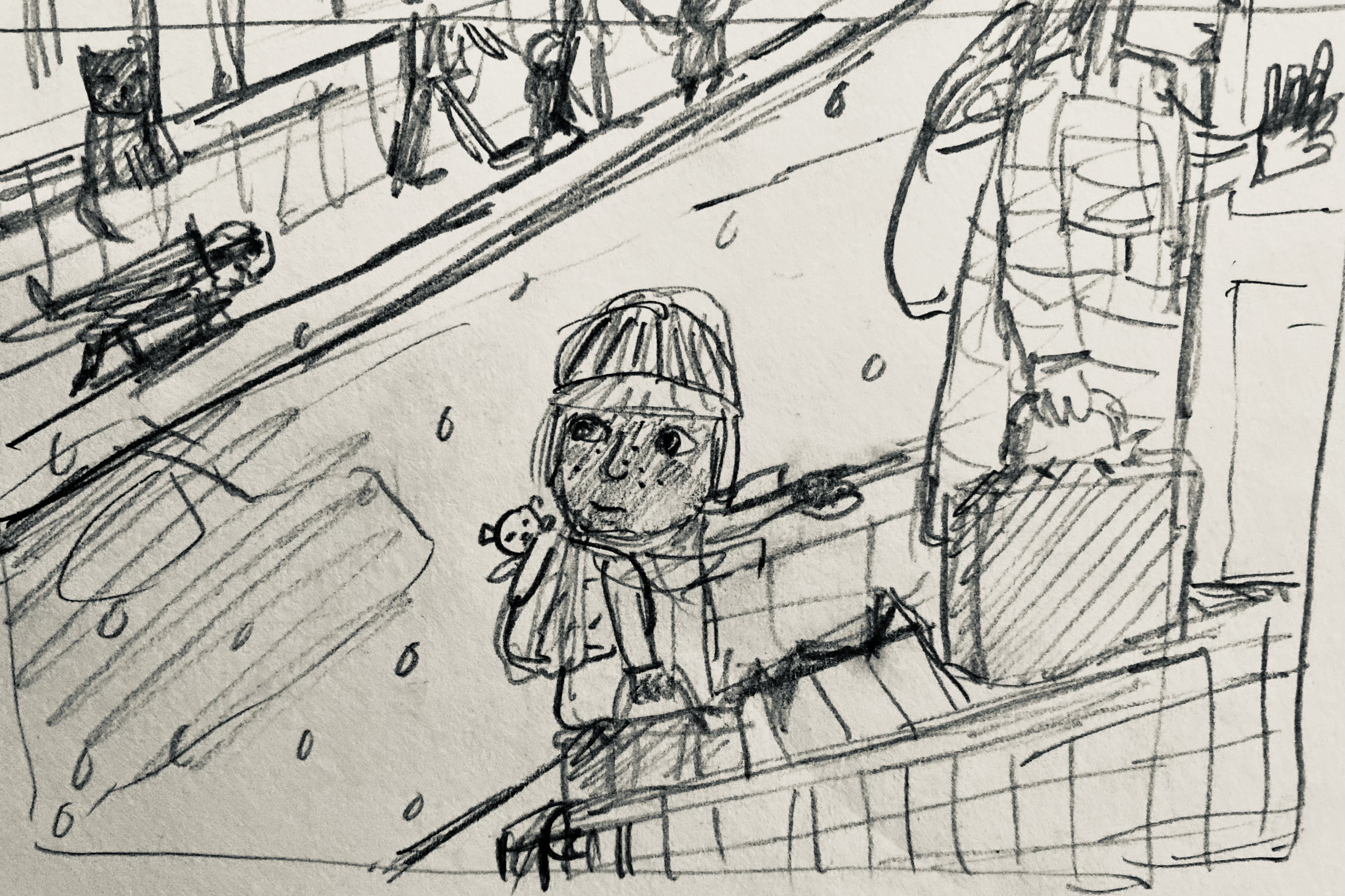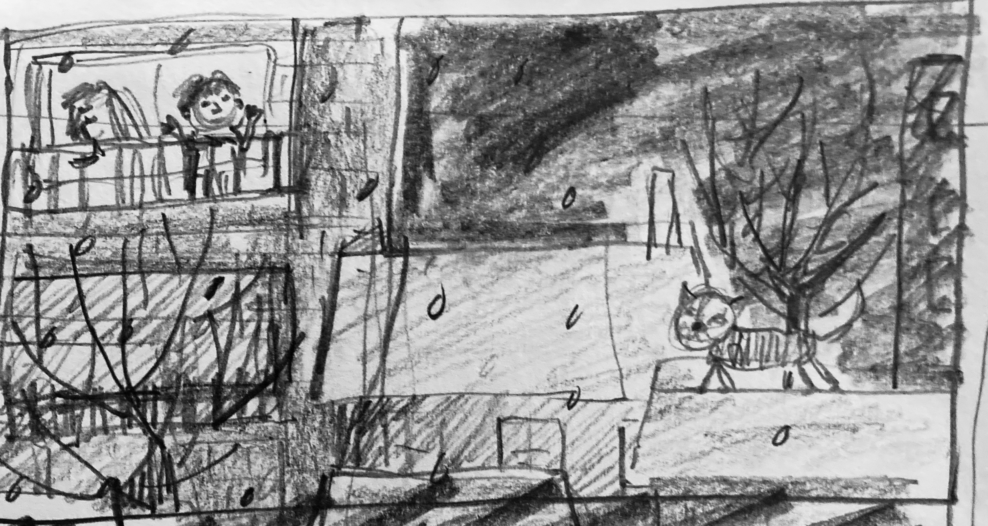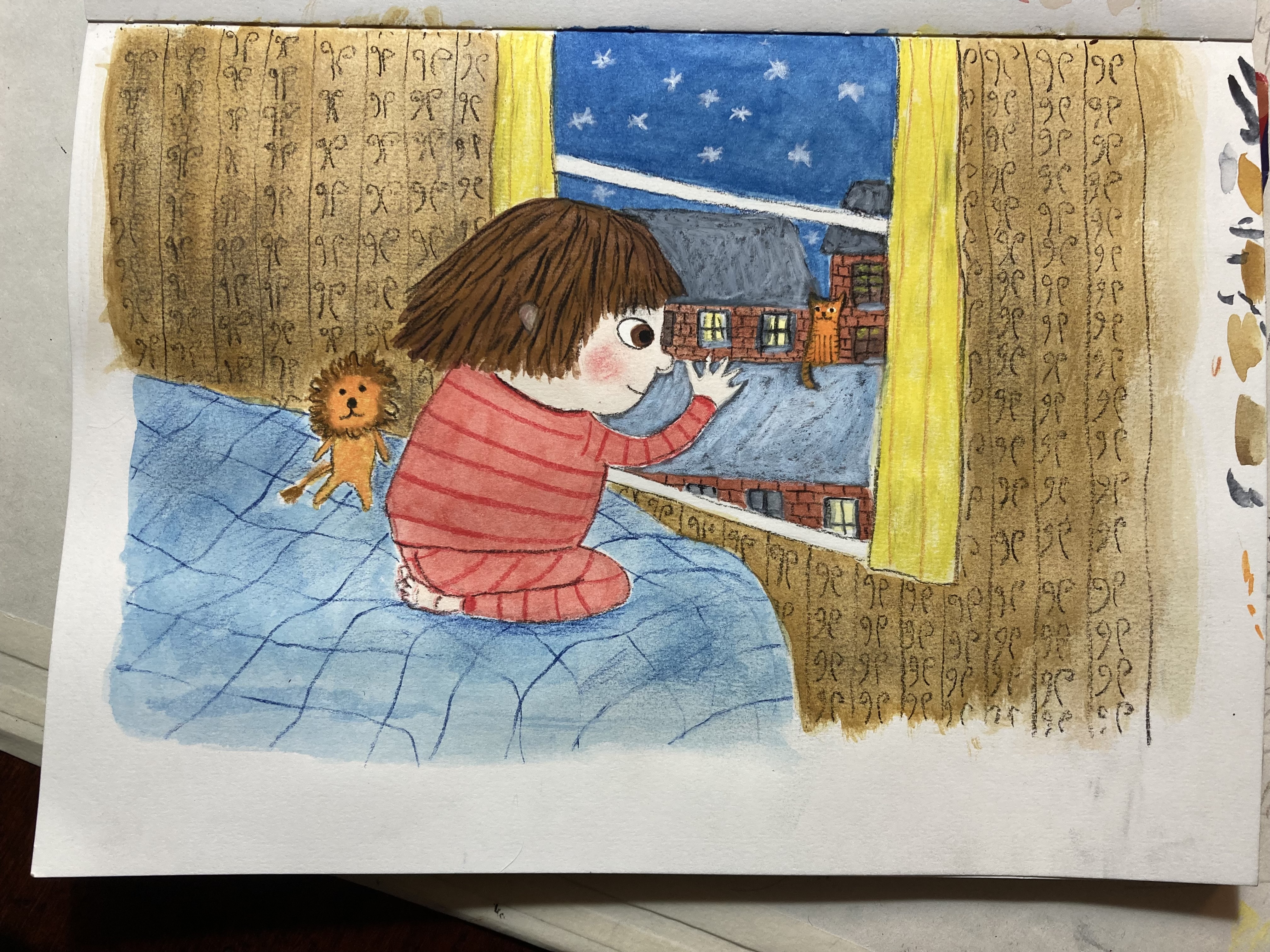 Homeless Oscar sees a stray ginger cat outside his new temporary home, and wonders if it is homeless like him and his mum. A series of six images for Orange Beak’s illustration challenge “Once Upon a Winter”