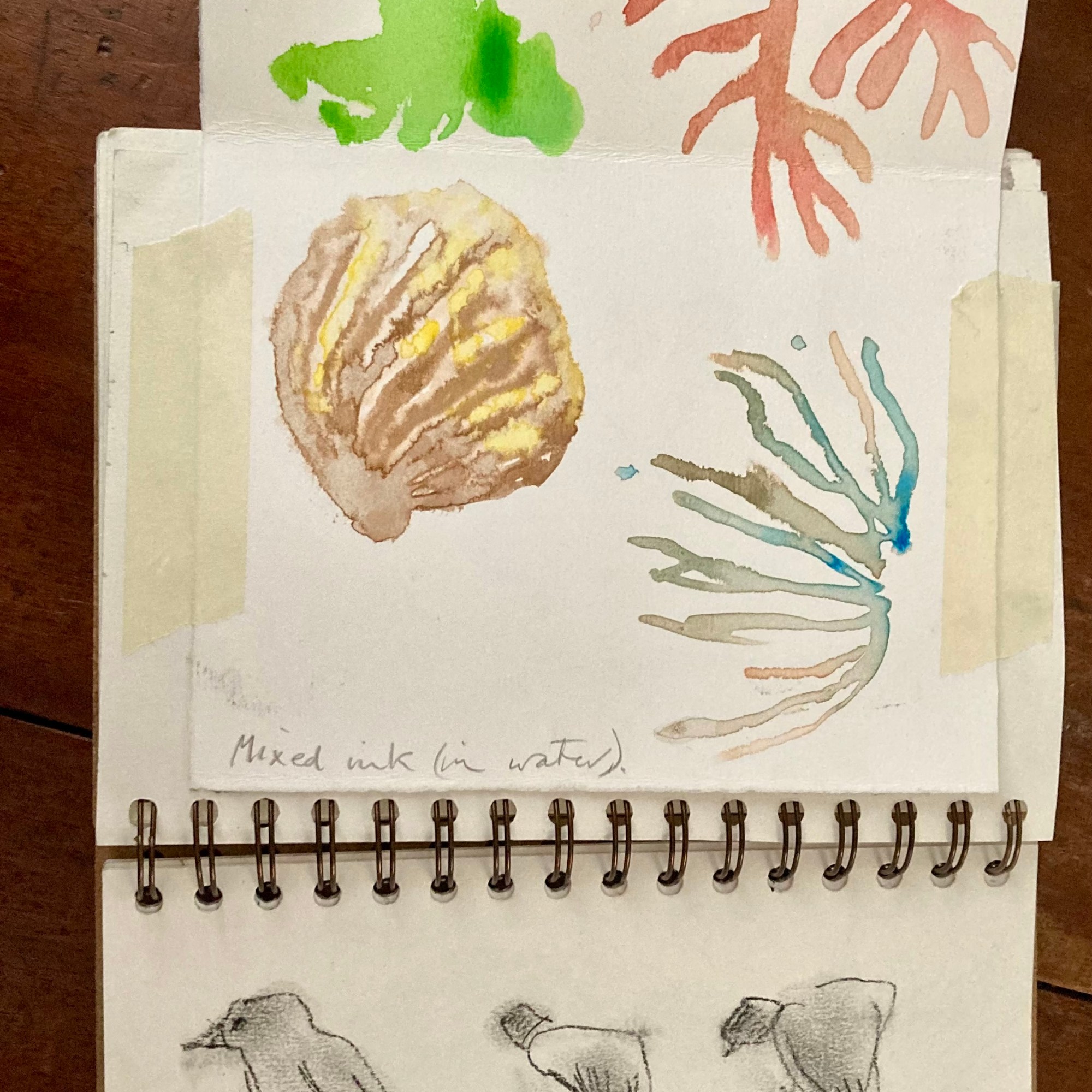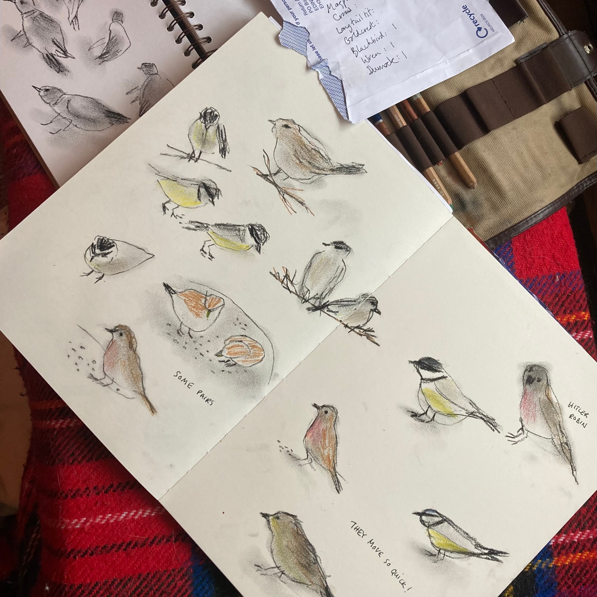 On the bus (with an excitable Exeter City supporter), the big garden birdwatch, a zig-zag card inspired by the coast at Dawlish , “Blue Bus Monkey” – a new character I spotted, winter walks, and watercolour sketches of rockpool life.