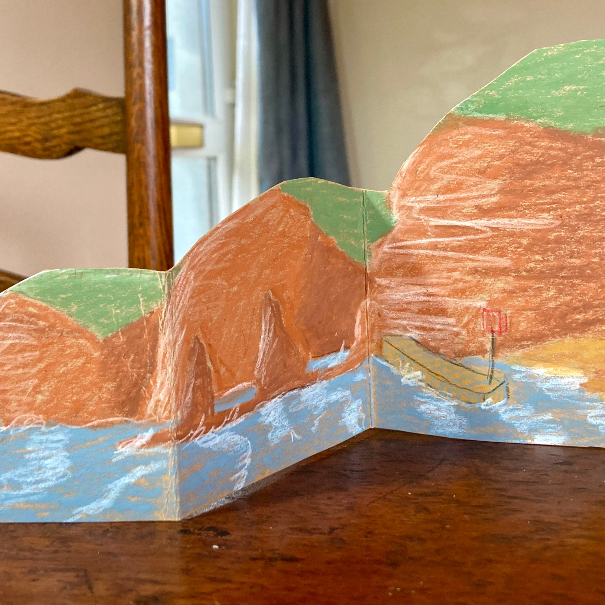 The panes show me as a small kid trying on hand-me-down clothes my Nana used to send. They were all ghastly and too big – Nana got them from another grandmother, whose granddaughter Alison was held up to me as the model of all that was wonderful in little girls. Needless to say I wasn’t a big fan of Alison – her clothes or her reputation – I always felt I must be inferior to her in everything!